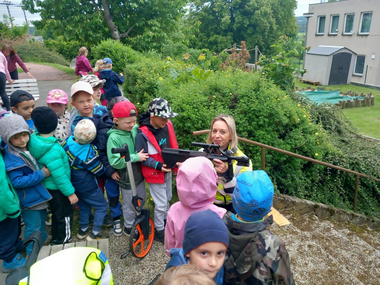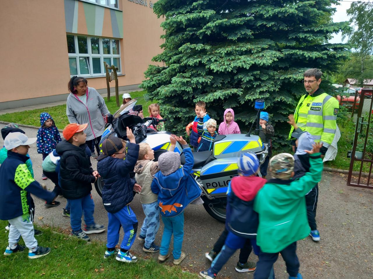 Jako každoročně čekalo děti povídání o bezpečnosti nejen na silnicí, ale také jak se správně chovat jako chodec a cyklista. Děti si prohlédly policejní vůz, vyzkoušeli policejní motorku a v ruce si podrželi skutečný samopal.