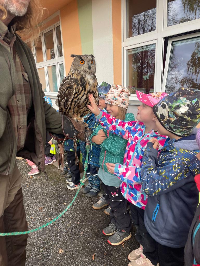 Pan Adámek ze záchranné stanice přivezl ukázat dětem vybrané sovy a dravce. Viděly je za letu "v akci". Věděli jste, že tvrzení o sově, že je moudrá, není pravda? Slepice je dokonce chytřejší!